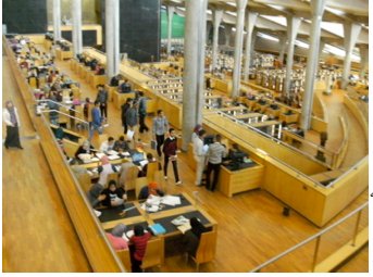 کتابخانهای با معماری منحصر بفرد و واقعا دیدنی. در این کتابخانه نیم دایره صدها دانشجوی دختر و پسر دور میزها نشسته بودند و درس میخواندند. تقریبا هیچ میزی ندیدم که دخترها و پسرها جدا نشسته باشند. ولی عجیب اینکه دخترها بلااستثنا روسری به سر داشتند. حتی یک دختر بیروسری ندیدم. تنها کارمندان و کارکنان کتابخانه اکثرا بدون روسری بودند. با توجه به آنکه درصد مسیحیها در اسکندریه از همه شهرهای مصر بیشتر است، برایم این صحنه عجیب بود. رانندهای که ما با وی آمده بودیم مسیحی بود. از او دلیل این امر را پرسیدیم و او گفت در این چند سال خیلی از مسیحیها هم برای همرنگی با دیگران روسری به سر میکنند و روسری نشانه مذهبی بودن نیست. ده سال پیش این طور نبود و اکثر دانشجوها بیروسری بودند. این تغییر از ده سال پیش بر اثر فعالیت گسترده و تبلیغات نیروهای مذهبی شروع شد و بخصوص در این چند سال اخیر شدت گرفته و امروز اکثریت قاطع دانشجویان دختر روسری به سر میکنند.