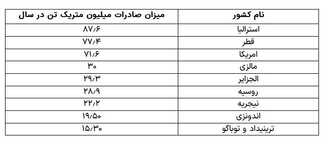 جدول زیر میزان صادرات گاز طبیعی مایع از سوی کشورهای مختلف در سال ۲۰۲۱ را نشان میدهد.(۸) از خاورمیانه فقط نام قطر در این جدول آمده که رتبه دوم را از نظر صادرات داراست. قطر قصد دارد تا سال ۲۰۲۷ صادرات خود را از ۷۷.۴ میلیون تن در سال به ۱۲۶ میلیون تن افزایش دهد.(۹) این جدول نشان میدهد که هیچ یک از کشورهای دیگر خاورمیانه در حال حاضر به علت نداشتن تکنولوژی گاز طبیعی مایع صادر نمیکنند. جالب است که استرالیا که در نیم کره جنوبی قرار دارد از طریق کشتی گاز مایع طبیعی را به کشورهای دیگر صادر میکند و دارای مقام اول از نظر میزان صادرات در سال ۲۰۲۱ بود. بر اثر جنگ اوکراین، آلمان ناگهان به قطر برای افزایش ظرفیت تولید گاز مایع و صدور ان به آلمان روی آورده است.(۱۰)