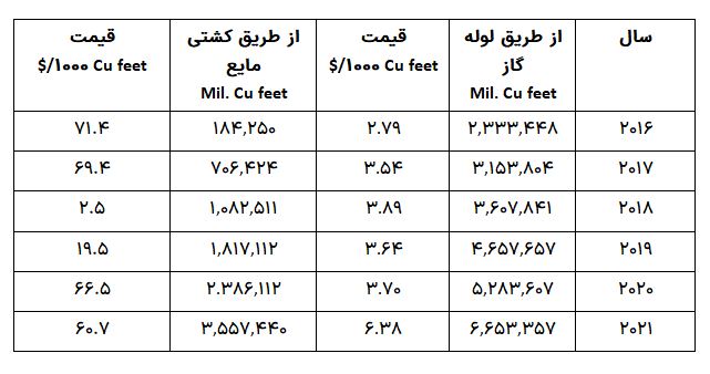 جدول زیر میزان صادرات گاز امریکا را به میلیون فوت مکعب در بین سالهای ۲۰۱۶-۲۰۲۱ نشان میدهد.