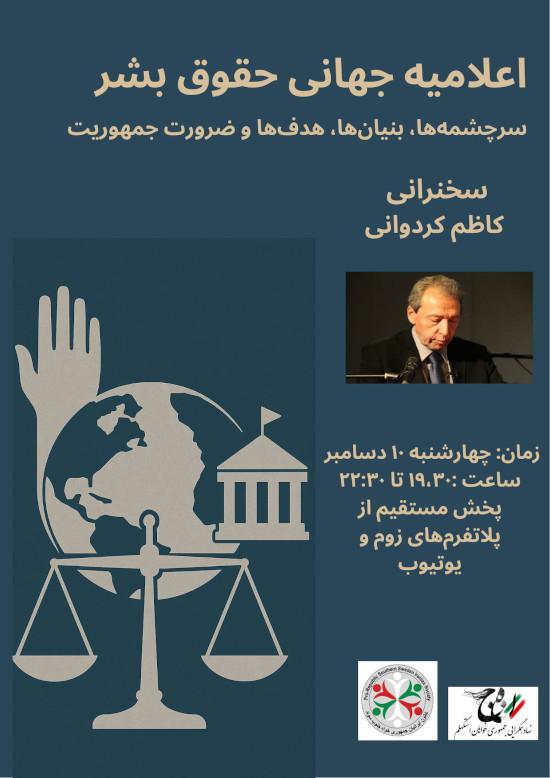 برنامه به مناسبت ۱۰ دسامبر،دروز جهانی حقوق بشر: سخنرانی کاظم کردوانی با عنوان اعلامیه جهانی حقوق بشر، سرچشمهها، بنیانها، هدفها و ضرورت جمهوریت