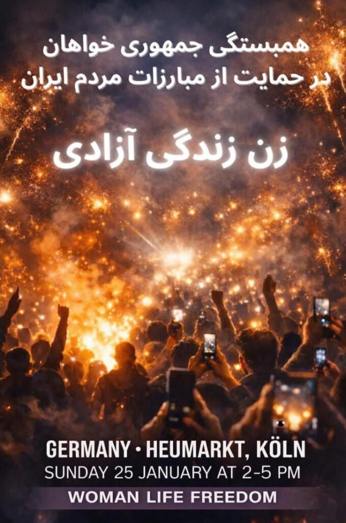 روز يکشنبه ۲۵ ژانويه ساعت ۱۴در شهر کلن تظاهراتی با عنوان “همبستگی جمهوری خواهان در حمايت از مبارزات مردم ايران” برگزار می شود. اين تظاهرات ضمن حمايت از مبارزات مردم، در اعتراض به کشتار بی سابقه مردم ايران توسط رژيم جنايتکار جمهوری اسلامی برگزار می گردد. جنايتکاران برای فرونشاندن اعتراضات بحق مردم ايران، هزاران معترض را کشته و بی شرمانه کشتار را به دولت های خارجی نسبت داده اند.