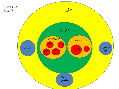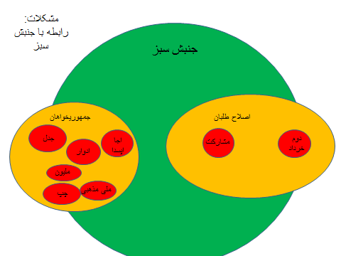 مواضع و موقعیت نیروهای سیاسی و بطور مشخص جمهوریخواه درعمل از مدل مجرد ارائه شده تبعیت نمیکند. در طرح ارائه شده بر اساس عمده ترین گرایشها، جمهوریخواهان و اصلاح طلبان به عنوان دو مجموعه از جنبش سبز ترسیم شدند ولی در واقعیت هم همه نیروهای جمهوریخواه و هم همه اصلاح طلبان خود را به این جنبش متعلق نمیدانند.