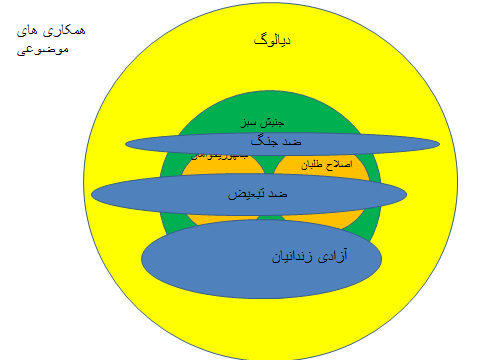 خواستهای مشخص و یا خواست های مطالباتی الزاما از چارچوبهای رابطه سیاسی مابین نیروها تبعیت نمیکند. مثلا برای دفاع از زندانیان سیاسی وحدت در خط مشی سیاسی ضرور نیست و نیروهایی که سیاست های متفاوت و حتی متضادی را تعقیب میکنند منطقا باید قادر باشند در این رابطه همسو حرکت کنند یا در تشکل هایی که منحصرا چنین وظیفهای را در برابر خود قرار دادهاند متشکل شوند. همگامی در پیشبرد پروژه های موضعی یا مطالباتی معین میتواند ظرفی باشد که در کنار دیالوگ امکان نزدیکی نیروها و یا حداقل فضای غیر خصمانه مابین نیروهای سیاسی را ممکن سازد.