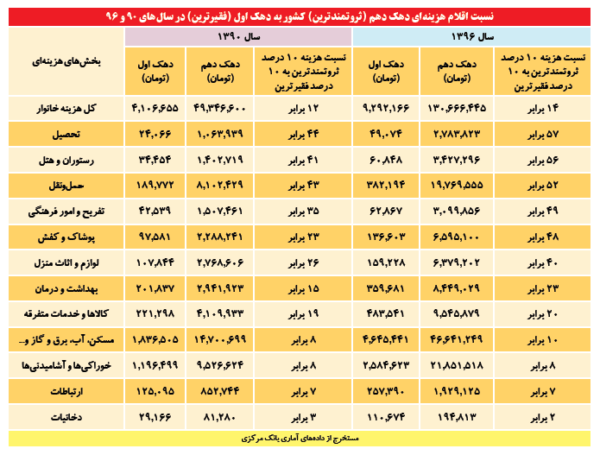 دهک دهم درآمدی دهم در سال ۹۰، (یک میلیون و ۴۰۲ هزار تومان) ۴۱ برابر دهک اول (۳۴ هزار و ۴۰۰ تومان) گزارش شده است. بررسی میزان هزینه خانوادهها دو دهک در سالهای ۱۳۹۰ و ۱۳۹۶ نشان میدهد که دهک دهم به نسبت شش شال قبل حدود ۲,۵ برابر برای رستوران هزینه کرده در حالیکه هزینه این بخش در دهک نخست کمتر از ۲ برابر افزایش یافته است.