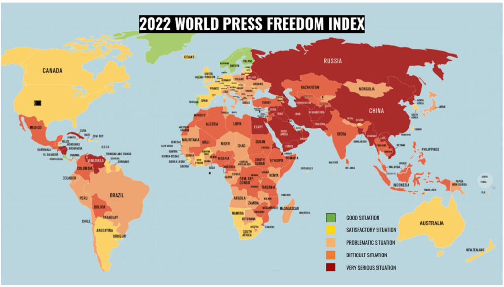 از آغاز جنگ روسیه در اوکراین عملا آزادی رسانه در روسیه وجود ندارد. این کشور در رده ۱۵۵ جدول آزادی مطبوعات قرار گرفته است.