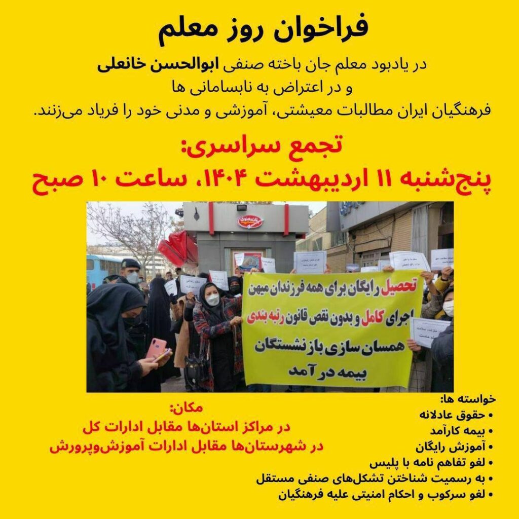 در دوازدهم اردیبهشت، روز معلم، یاد جانباختن ابوالحسن خانعلی و مبارزات پیگیر معلمان ایران برای حقوق صنفی، کرامت شغلی و عدالت آموزشی را گرامی میداریم.