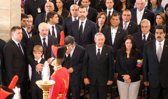 محمود احمدی نژاد بر تابوت چاوز در کاراکاس گریست؛ وى پس از آنکه در کشور، عزاى عمومى اعلام کرد عصر ۵شنبه گذشته به مراسم تشییع رییس جمهور ونزوئلا رفت اما فضاى عمومى ایران از جامعه تا رسانه ها با این اعلام، همراه نشدند و برخى آن را “عزاى خصوصى” توصیف کردند. در سفر رییس دولت به ونزوئلا کسی از دفتر رهبری براى بدرقه اش حضور نیافت این در حالى است که در طول دوران ریاست احمدى نژاد بر دولت، همواره «محمدی گلپایگانی» به عنوان رئیس دفتر آیت الله خامنه اى و یا «دکتر علی اکبر ولایتی» به عنوان مشاور رهبری در امور بین الملل در بدرقه سفرهاى خارجى رییس دولت حاضر مى شدند.